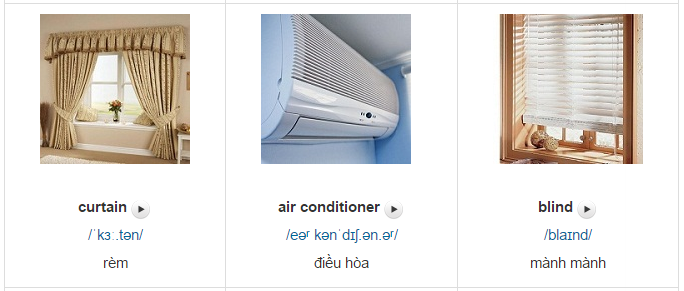 - air conditioner /eəʳ kənˈdɪʃ.ən.əʳ/: điều hòa
