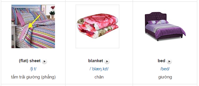 - bedspread /ˈbed.spred/: khăn trải giường (trải bên trên chăn và tấm trải giường phẳng)