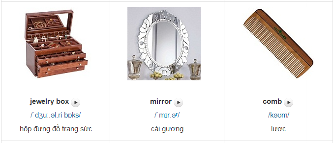 - jewelry box /ˈdʒuː.əl.ri bɒks/: hộp đựng đồ trang sức